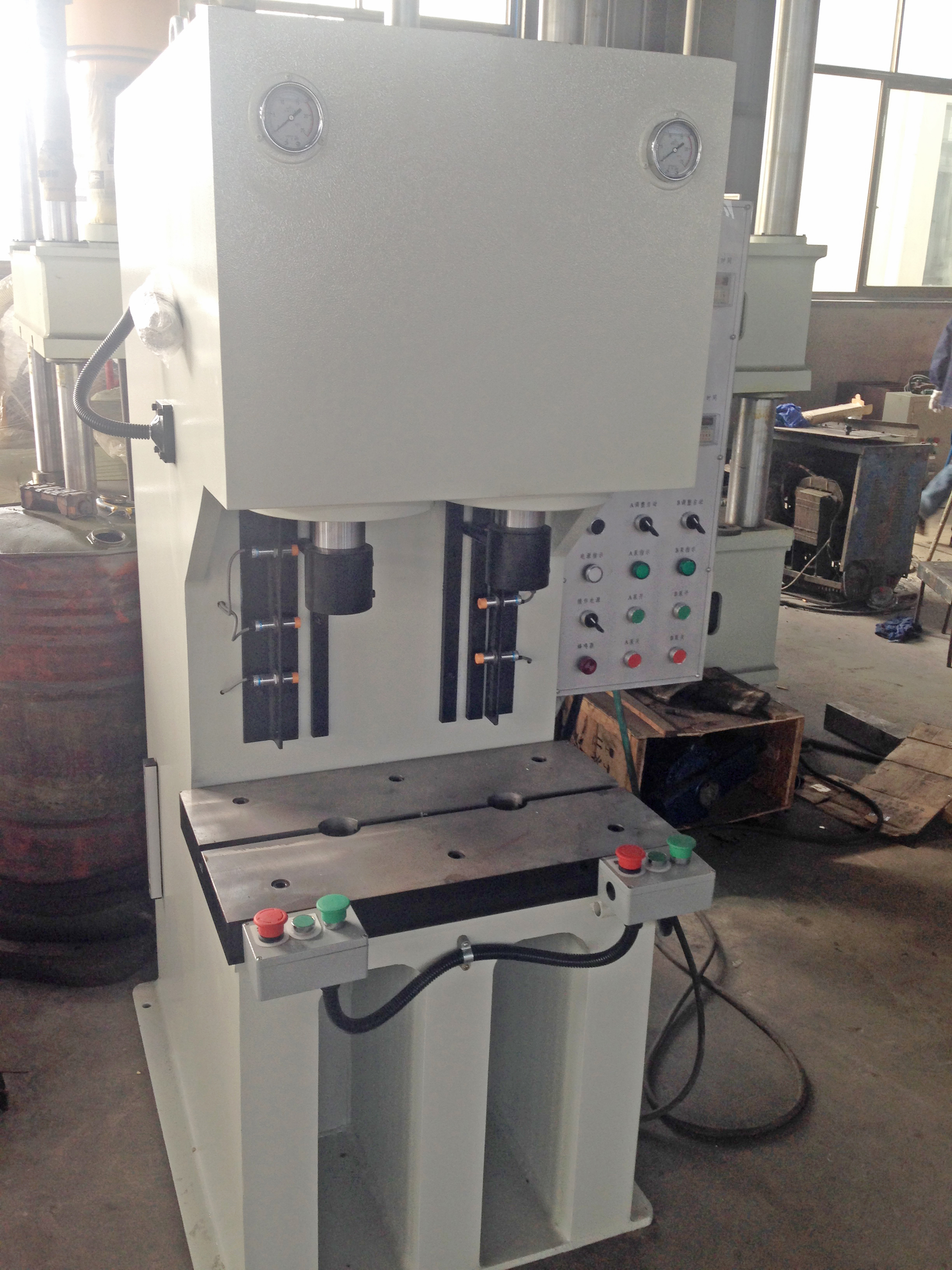 性能特點:本系列單柱式液壓機通過計算機優化直立式C型結構設計,剛性好,采用鋼板焊接,焊接后通過回火時效處理,確保機身永不變形。液壓系統安裝于機身內,外型美觀,結構緊湊,操作方便。本系列液壓機設有獨立的液壓與電器控制系統,采用按鈕集中控制,可實現定程和定壓兩種成型工藝,機器行程、壓力可在規定范圍內調節;本壓機壓頭采用四柱導向,具有抗偏載能力。