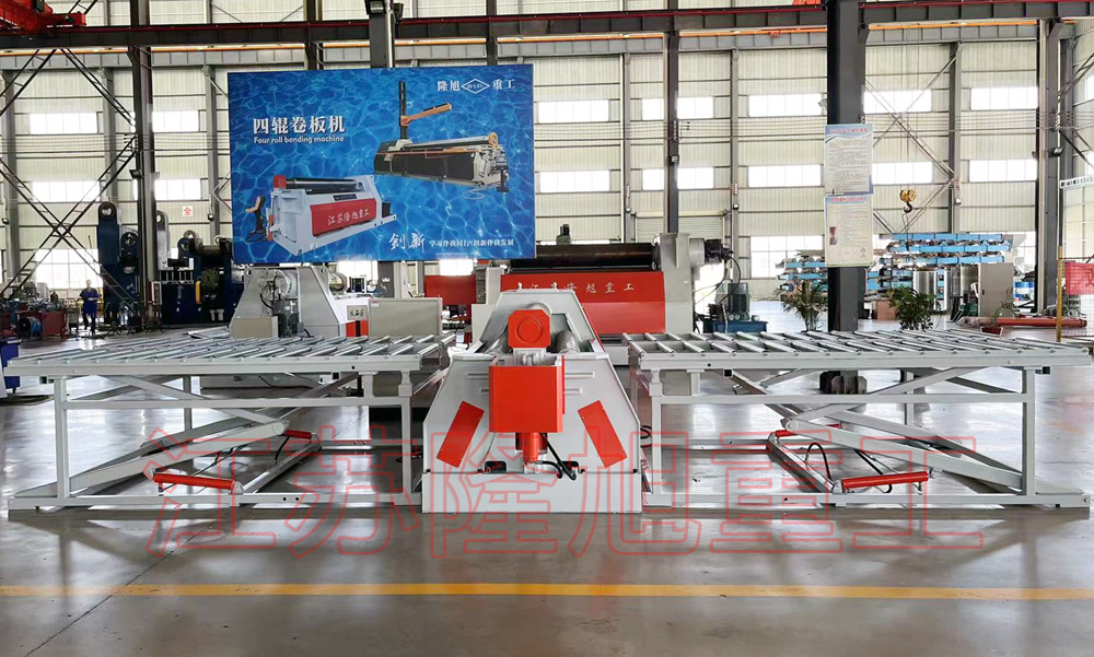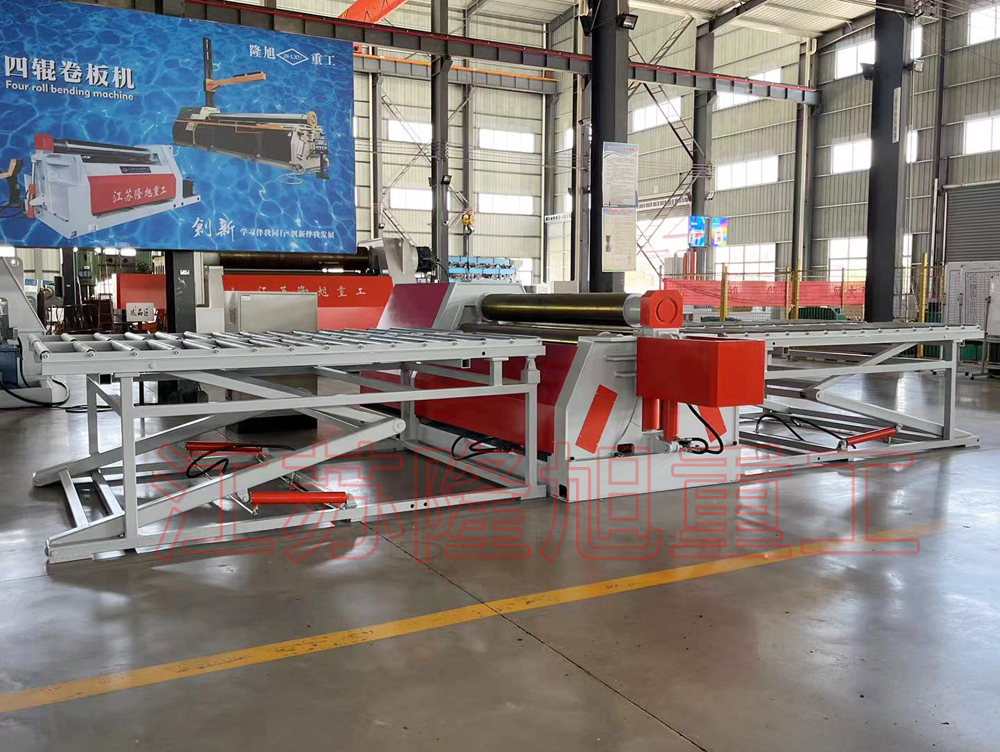 兩側設浮動側托架裝置,用于支撐還未完全成型直筒。可防止薄、寬板材在卷制過程中在下部變形而設計,通過油缸推動轉臂從而使托架上的托輥靠近所卷制的板材。根據卷制板材弧度的大小調節油缸伸縮的長度便能達到對板材變形控制的目的。